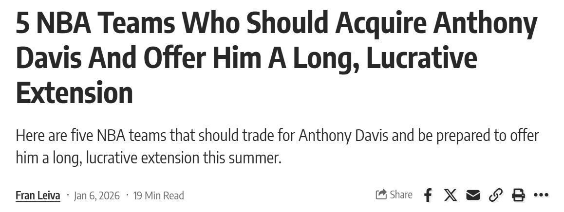 3年1.75亿,浓眉哥遭疯狂兜售!美媒晒5大下家候选:勇士位列第4